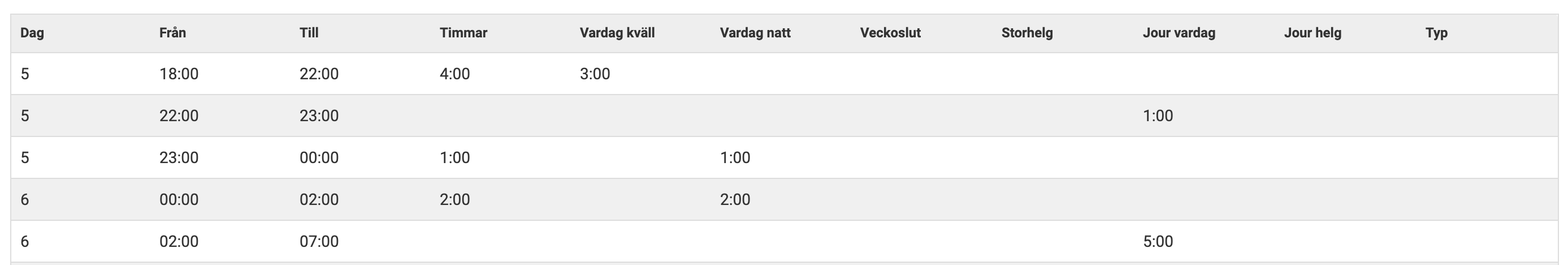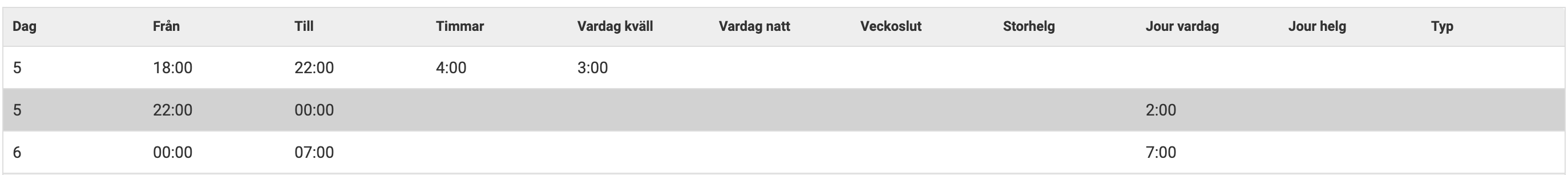 Nedan kan vi se att det nu finns aktiv tid registrerad mellan jourtimmarna.