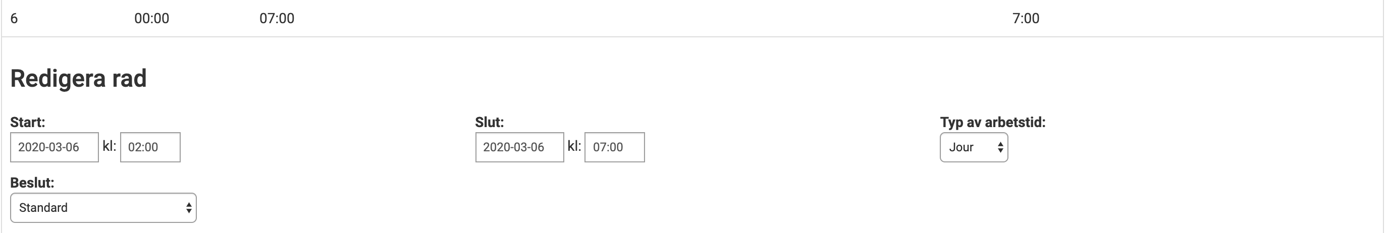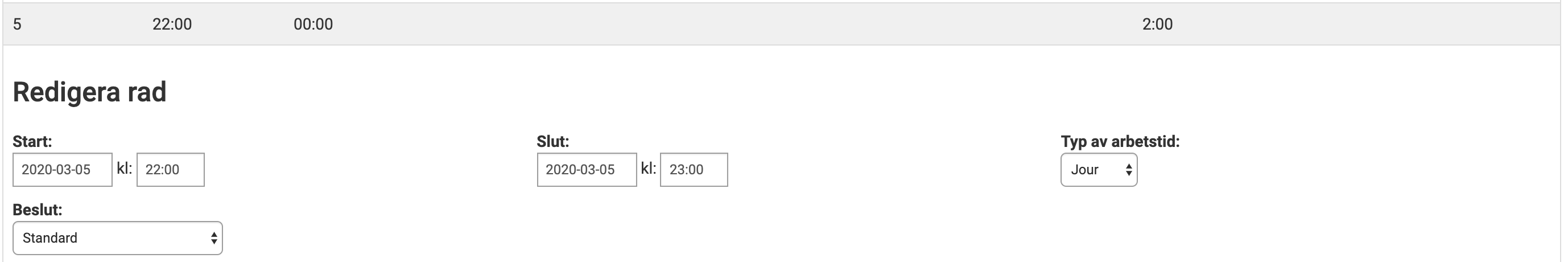 Rader i tidrapporten kan endast redigeras bakåt i tiden. Det går alltså inte planera in ett jouravbrott framåt i tiden via tidrapporten.